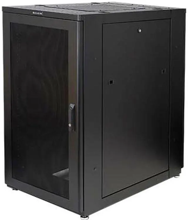 The 24U Premium Enclosure from Belkin provides added security for your critical networking equipment. Engineered to be exceptionally sturdy, it has been strength-tested to hold up to 2,000 pounds. Adjustable mounting rails accommodate equipment of varying depths, and horizontal channel markings ensure accurate rail adjustment. Our Enclosure also includes lockable doors and side panels that can be removed for convenient equipment access.Color: BlackMaterial: SteelHeight: 48Width: 24"Depth: 42"Rack Height: 24URack Width: 19"Country of Origin: United States"