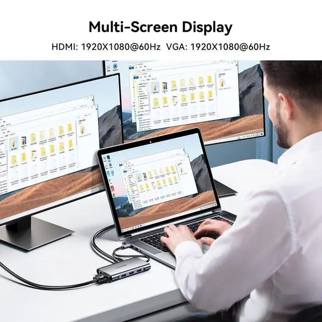 Dual Display with HDMI & VGASupports 4K HDMI output and 1080P VGA output, enabling mirror or extended screens to TVs, monitors, or projectors. Ideal for multitasking like video editing, presentations, or gaming setups. Connect HDMI + VGA simultaneously for dual-screen productivity.
