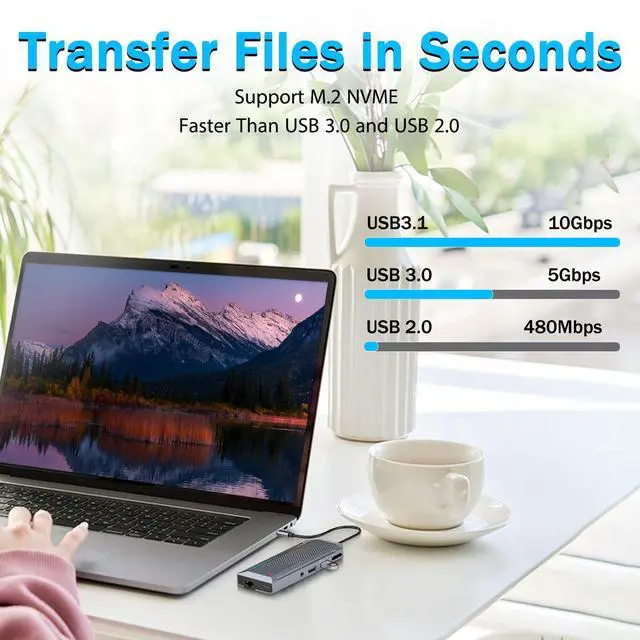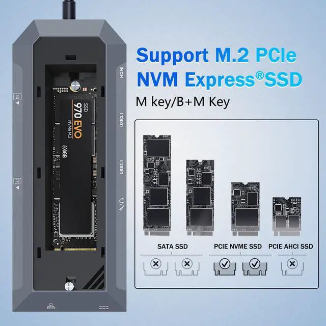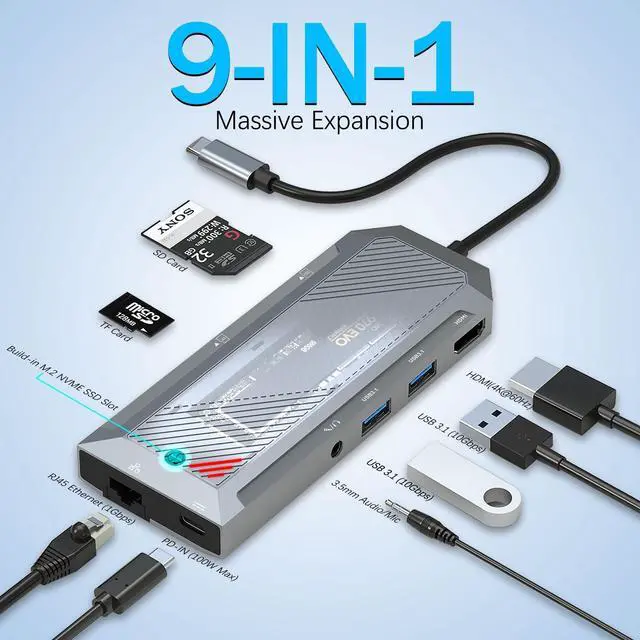 Ultimate 9-in-1 Connectivity: Combines an M.2 NVMe SSD enclosure (supports 2230/2242/2260/2280 sizes), 4K@60Hz HDMI, dual 10Gbps USB-A 3.1 ports, 100W PD-IN charging, Gigabit Ethernet, SD/TF card readers, and a 3.5mm audio/mic jack for seamless multitasking.