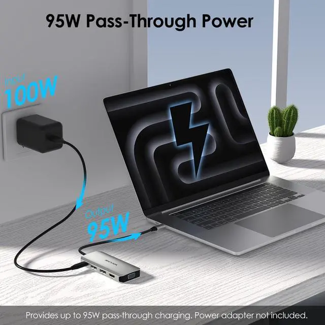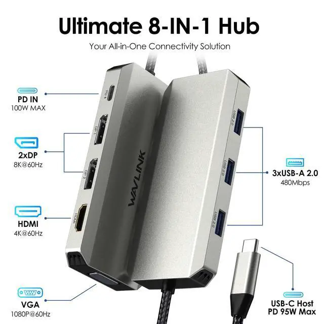| Ports: | 1x USB-C(PD IN,100W),1x HDMI (4K@60Hz), 2x DP1 (8K@60Hz),1x VGA(1080P@60Hz), 3 x USB2.0-A(480Mbps) |