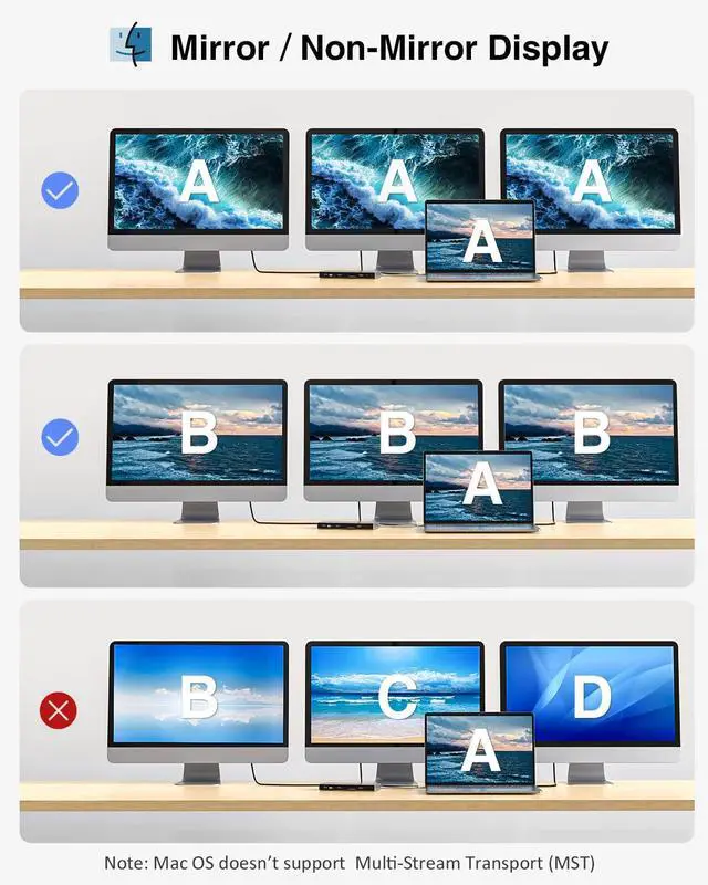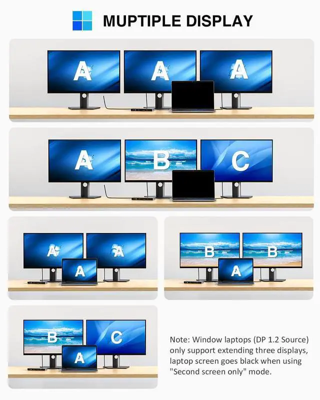 - Triple Display Mode: three extended monitors and laptop screen stays off.