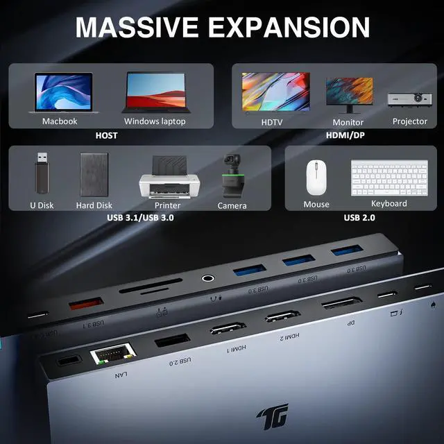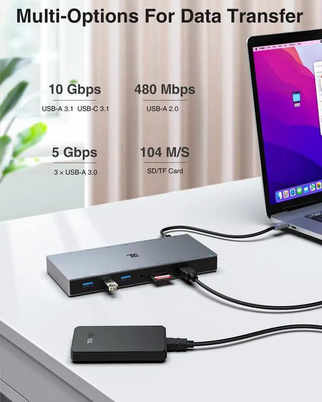 Support up to 100W PD charging, and this Dock quickly charges MacBook or other Window laptops with the USB-C Port.