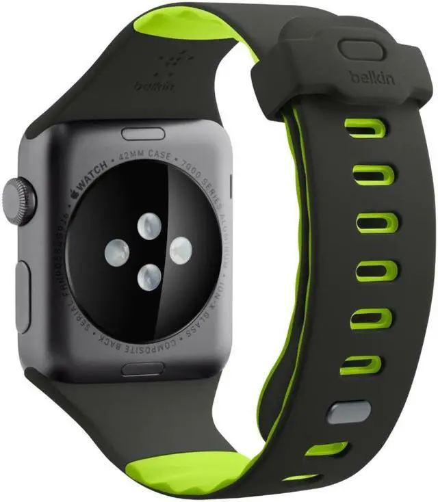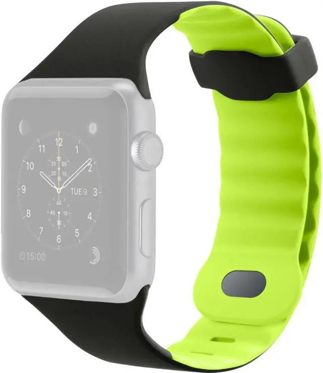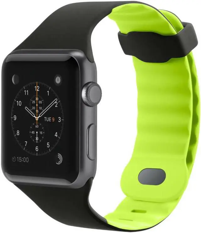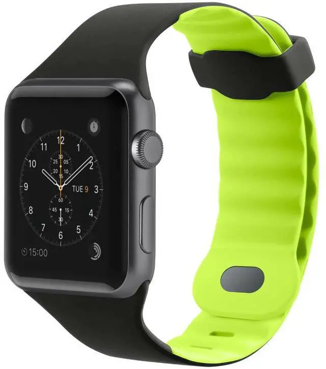 Take advantage of all the fitness features of your Apple Watch with a watch band that can keep up with the toughest workout - the Sport Band for Apple Watch 40mm / 38mm. Wave design ridges keep air flowing for a comfortable yet secure fit that stands up to the most demanding fitness regimen. Details like a dual-locking buckle and custom hardware add to its sporty appeal. Features: Sturdy enough to keep your watch secure, yet soft and flexible against your wrist, the Sport Band is the perfect workout buddy for your Apple Watch. Made of high-performance silicon, this sports watch band has wave design ridges that let cool air flow when your workout heats up. The dual-locking buckle also stays secure on your wrist to ensure full sensory engagement throughout your workout. Despite its good looks, the Sport Band is highly durable. It resists sweat and UV rays which can cause discoloration. The band is fully hand-washable with a protective added coating to preserve the look and feel between washes. The Sport Band remains completely comfortable no matter how hard you work or play. Compatible with Apple Watch Series 5 40mm / Series 4 40mm / Series 3 38mm / Series 2 38mm / Series 1 38mm. Color: Blacktop Flash.