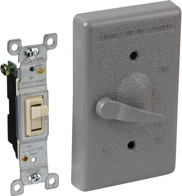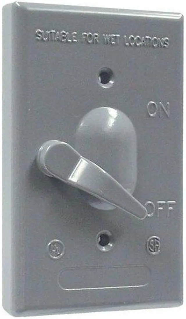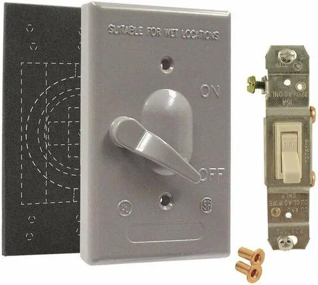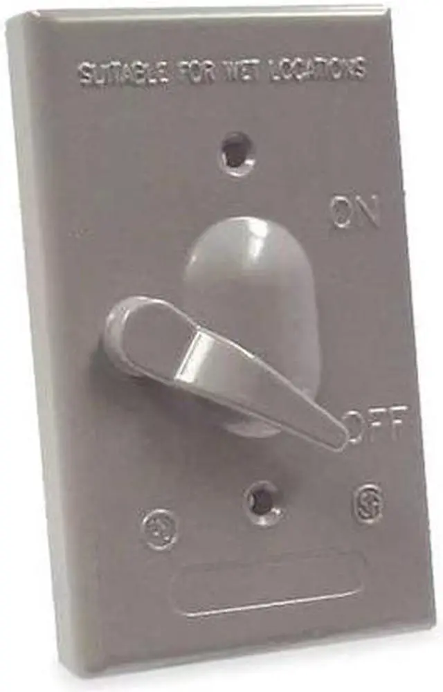 Weatherproof Cover, Mounting Box FS or FD Weatherproof Boxes, For Use With On-Off Type Switches, Mounting Orientation Vertical, Lid Style No Lid, Number of Gangs 1, Gasket Material Neoprene, Cover Material Die-Cast Zinc, Color Gray, Height 4 1/2 in, Width 2 3/4 in, Depth 1 37/64 in, NEMA Rating 3R, Standards CSA, UL Listed, Includes Gaskets, Mounting Hardware. This item has been restricted from sale in the following state (s): []