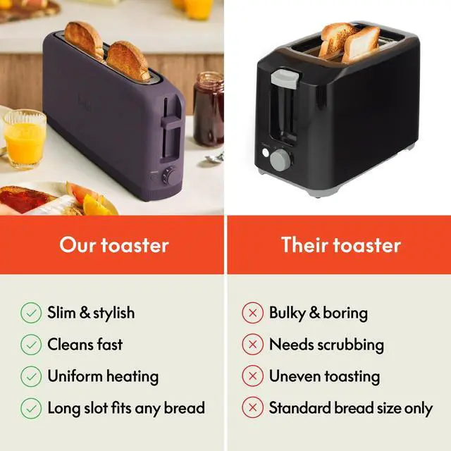 Slim Design, Big Impact: With a sleek 3.58" profile, the bella 2-Slice Slim Toaster fits comfortably on any countertop without taking up much space. Part of our Fits-anywhere kitchenware collection, its the perfect blend of style and practicality
