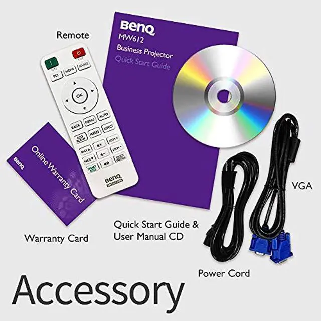 Contents: MW612 Wireless Meeting Room WXGA Business Projector Carry Bag 1 x Remote Control w/ Battery (RCX014) 1 x Power Cord ( 1.8 m) 1 x User Manual CD (24L) 1 x Quick Start Guide (18L) 1 x Warranty Card (by region) 1 x VGA(D-sub 15pin) Cable ( 1.5 m)
