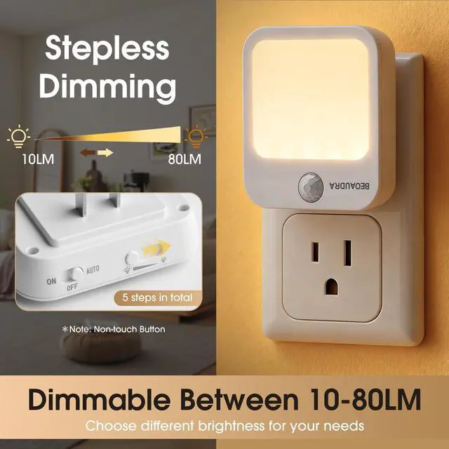 5-Level Dimmable Warm White Brightness Customize soft 3000K warm glow (up to 80 lumens) with easy slide control perfect non-glaring light for midnight bathroom trips, kids' rooms, or bedrooms without disturbing sleep. Ideal plug in motion sensor night light indoor.