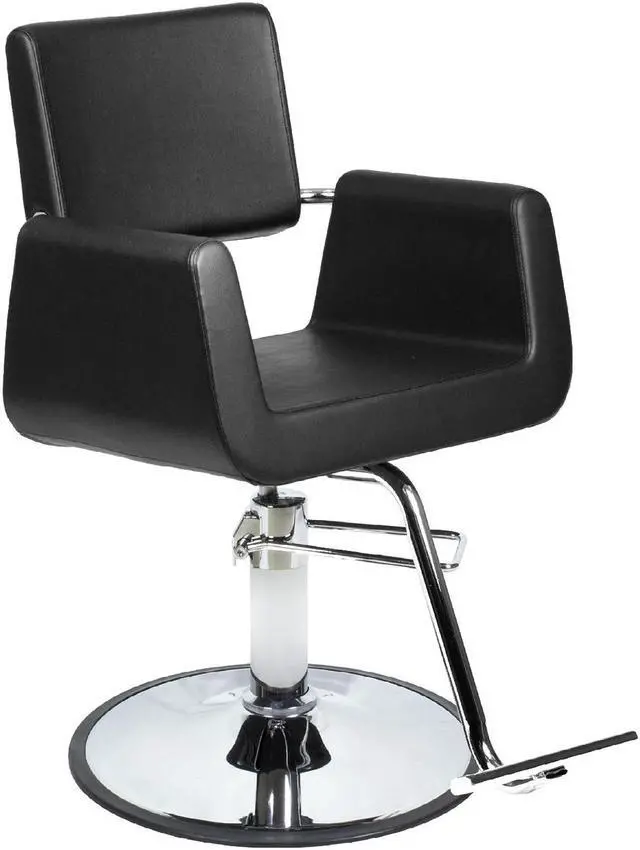 The Aron Styling Chair is a stunning and modernistic inspired styling chair. Its sleek black streamline cube design will flatter any salon décor. Shiny chrome accents complete the look along with high quality upholstered black vinyl and dense cushioning. Perfect choice for high-end salons. Upgrade the Aron styling chair with our selection of sturdy stainless steel heavy duty pumps.