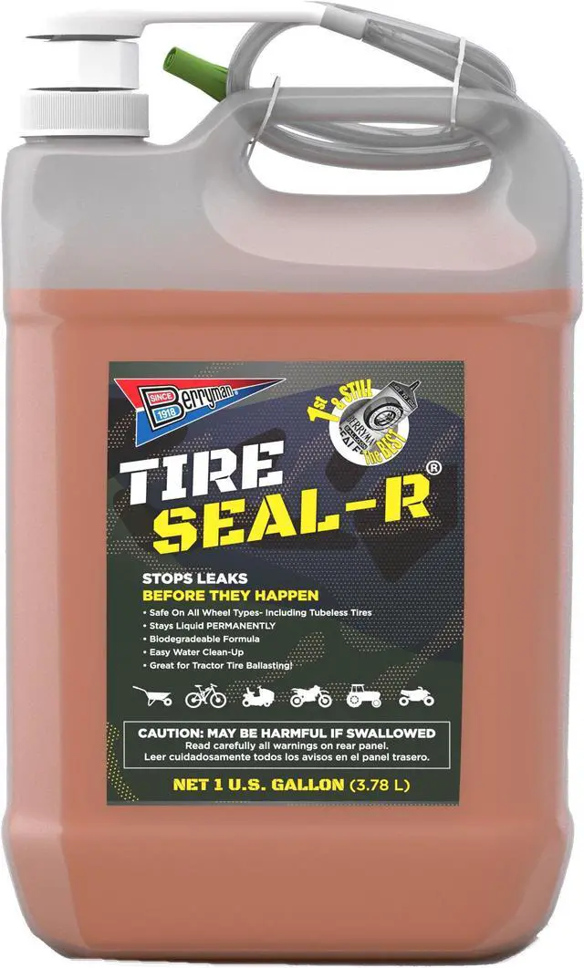 Berryman Seal-R Tire Sealing Compound instantly seals leaks and protects pneumatic tires and tubes from small nails, thorns, and other sharp objects. Stays liquid permanently and uses innovative fiber technology to plug leaks and prevent loss of air pressure. Advanced corrosion inhibitors protect all types of wheels, including steel, chrome, and alloy. Seals porosity leaks in magnesium and aluminum composition wheels. Available in a variety sizes for any job. Nonflammable and biodegradable formula. Great for tractor tire ballasting.