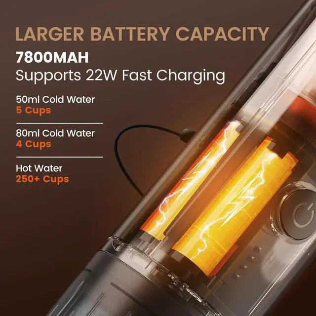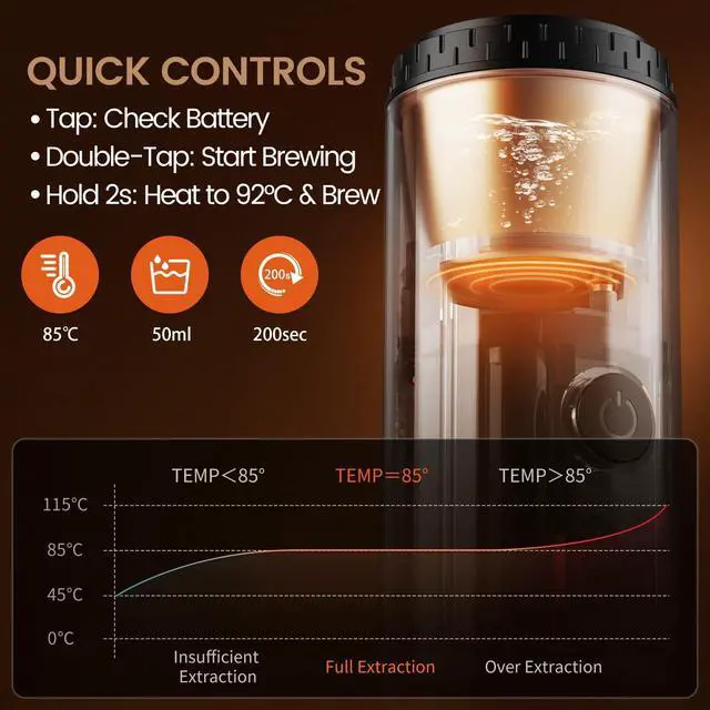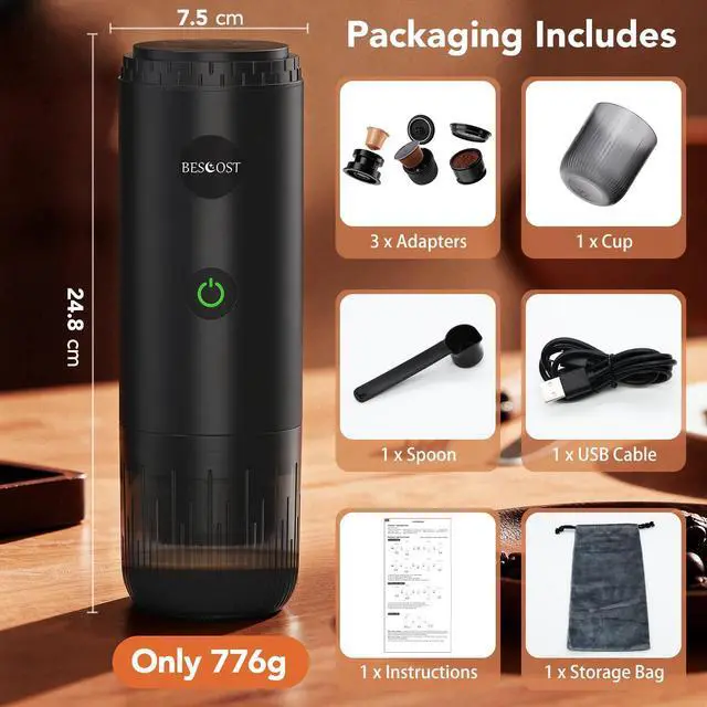 Enjoy café-quality espresso anywhere. This portable espresso maker combines 20-bar high pressure with a powerful 7800mAh rechargeable battery to deliver rich crema and authentic espresso flavor on the go. With its 200-second fast heating system, water reaches the perfect brewing temperature in minutes, ensuring bold taste every time. Designed with an 80ml water tank and weighing only 776g (1.7 lbs), this mini coffee machine is compact, durable, and easy to clean. Its compatible with Nespresso pods (NS & DG) as well as ground coffee, giving you maximum flexibility for your coffee preferences. Perfect for travel, outdoor adventures, office breaks, or car use, this espresso maker comes with complete accessories, including a scoop, cleaning brush, storage bag, USB-C charging cable, and car adapter. Whether at home or on the move, enjoy the freedom of fresh espresso anytime, anywhere.