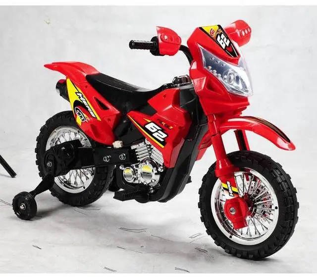This ride on Mini Dirt Bike with 6V battery and motor, with training wheels, and alloy like rims. Mini Dirt Bike with 6V battery and motor, with training wheels, and alloy like rims.