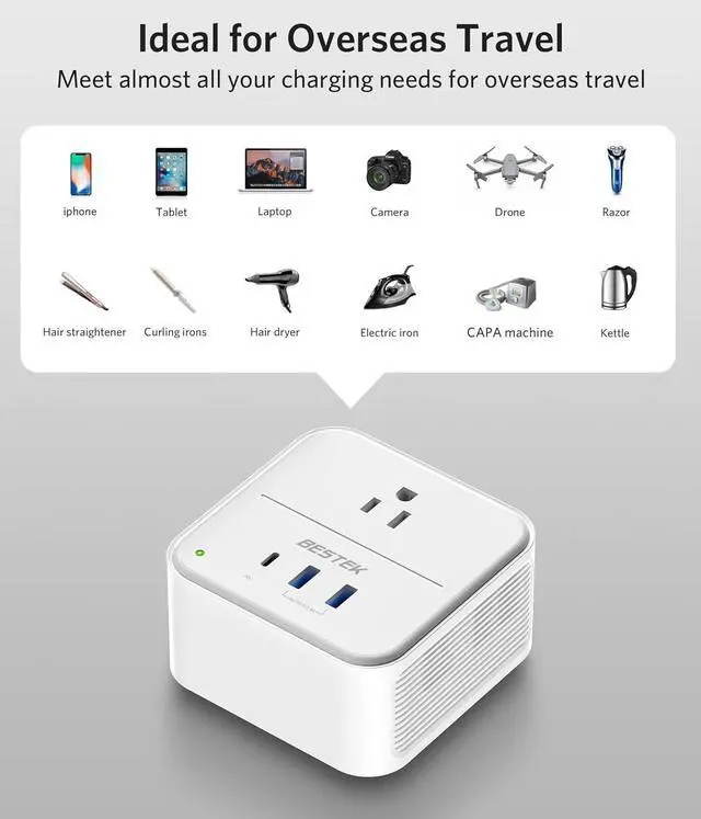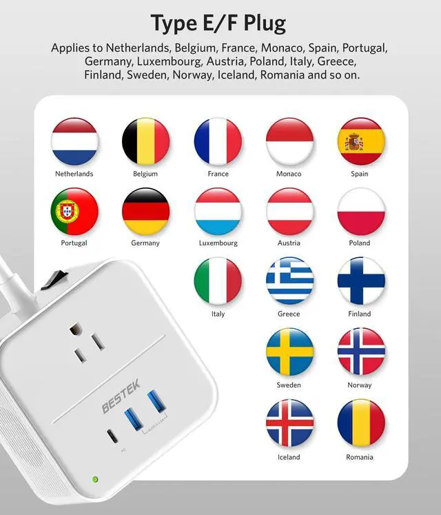 Ready for European Travel Type E Plug Compatibility: Specifically designed as a voltage converter US to Europe, BESTEKs adapter features a premium Type E plug, compatible with Type C and F sockets. Perfect for trips to France, Germany, Italy, Greece, Iceland, and other popular EU destinations.