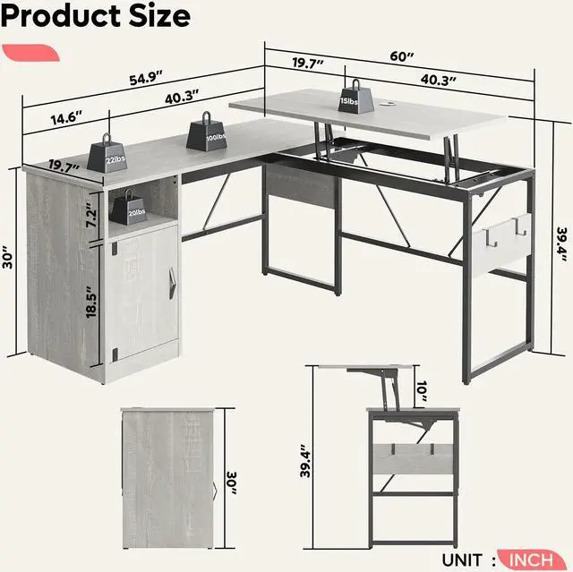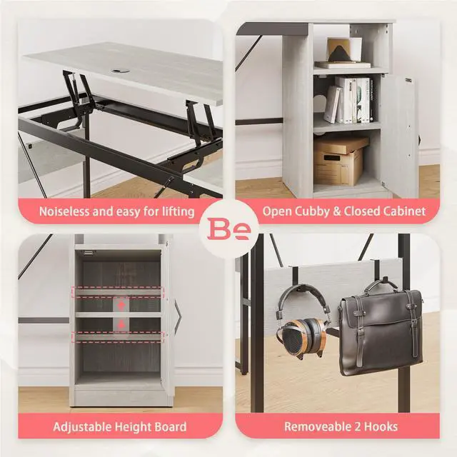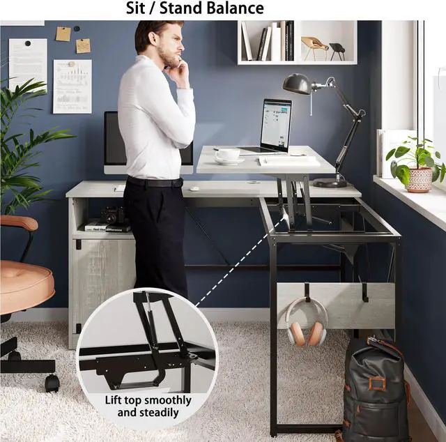 This versatile L-shaped desk can be transformed into a straight long desk to suit various uses such as writing, studying, and gaming. It features an adjustable lift top for easy transition between sitting and standing, promoting proper posture and relieving back strain. The desk also offers flexible storage options with a reversible storage cabinet, an open cubby shelf, and a convenient hook. Built with a robust metal frame and thick boards, it is designed for long-lasting use. Additionally, the desk is easy to assemble with well-organized and labeled parts and accessories, and it comes with a 12-month guarantee for customer peace of mind.