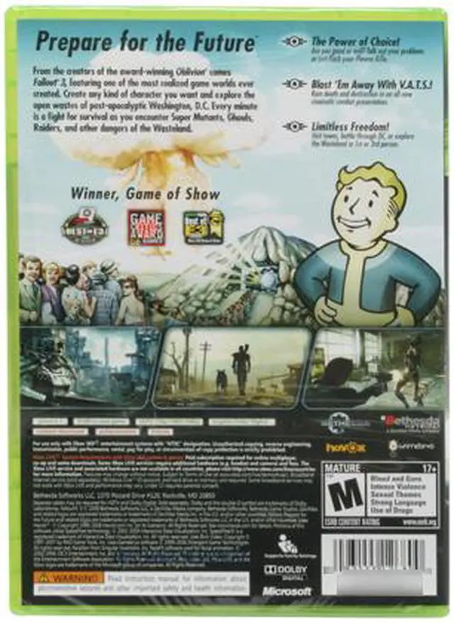 It's been ten years since the release of Fallout 2 and 227 years after the nuclear devastation that all but destroyed humanity and now Bethesda Games returns you to the post-apocalyptic remains of what used to be Washington DC, packed with detail and excitement as you explore 2277. You get multiple challenges with consequences or rewards based on your actions. Build your character through pivotal events of your childhood in Vault 101. Assign skill points to reflect your style of play and put yourself to the test as you venture out into the sunlight in the shattered remnants of Washington DC in search of your father – the first man to leave the Vault.