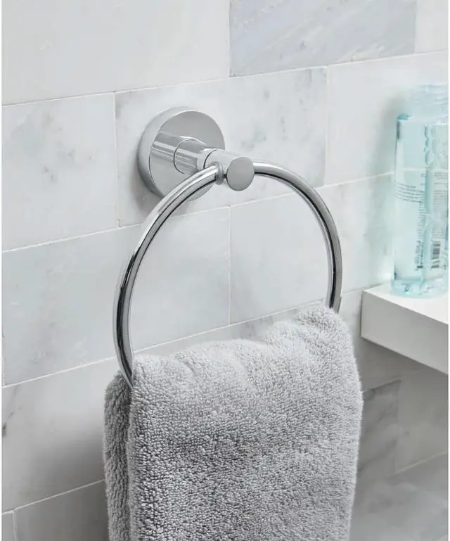 Add beauty and function to your bathroom decor with the Better Homes and Gardens Towel Ring. It provides you with a place to put your towel when you are done using it. The chrome towel ring also allows for quicker access to your washcloth or towel. It is designed for a wall mount. Made of sturdy materials, the bathroom hardware includes everything that you need to get the unit hanging properly in place, including a set screw mount. It also coordinates with other pieces in the collection. Instantly upgrade your space today with the Prescott Collection by Better Homes & Gardens chrome towel ring.