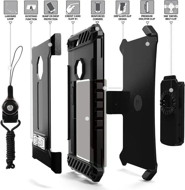 CUSTOM HOLSTER CLIP: This case also comes with a custom belt clip holster. This holster is made to fit the phone with case. The design allows you to insert the phone face-inward for optimal protection. The industrial belt clip will turn/lock in 20 different positions.