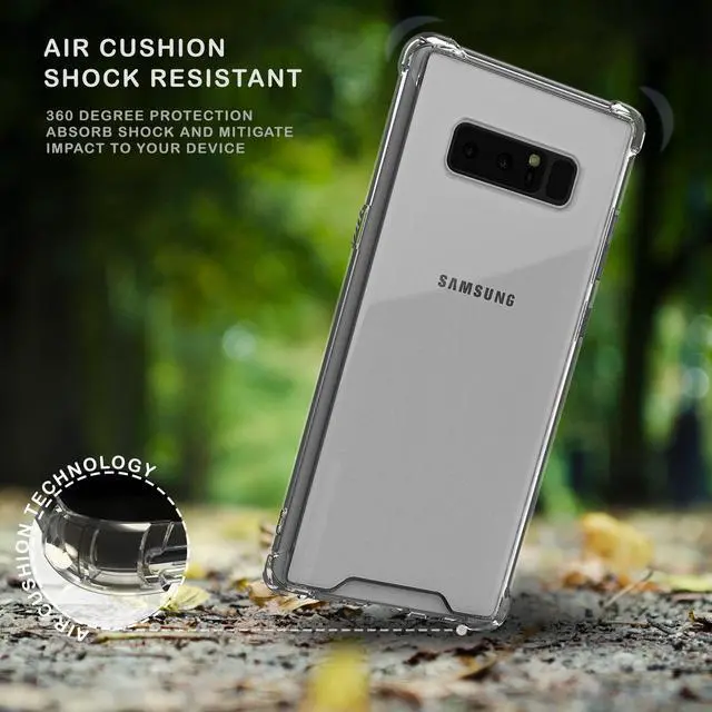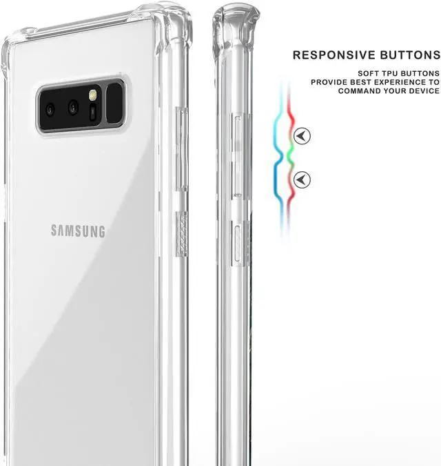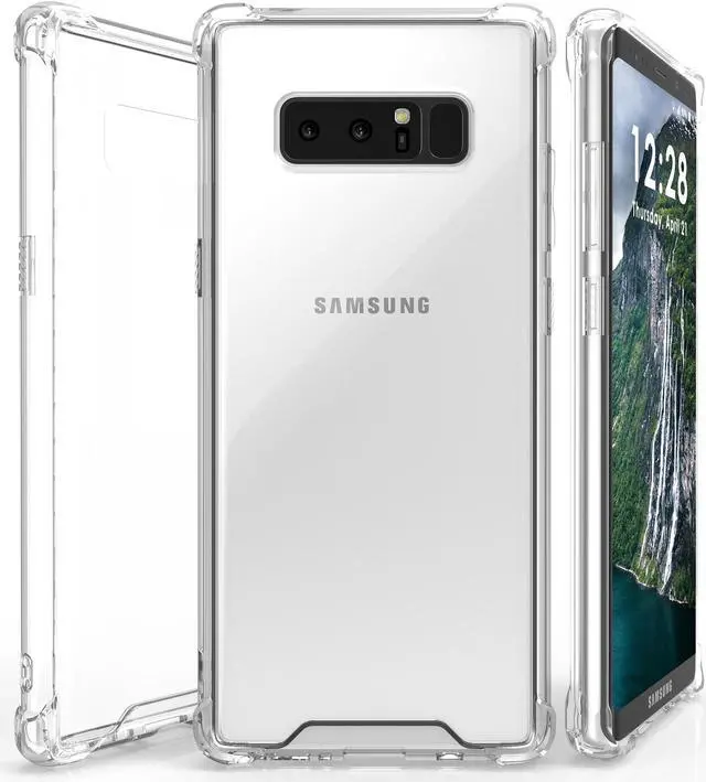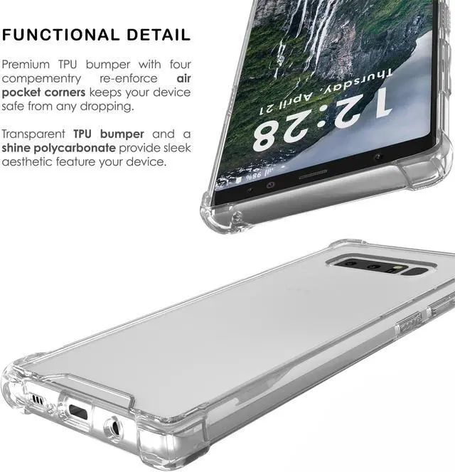 MATERIAL: This is a one-piece case that combines hard plastic with flexible shock-absorbing TPU bumper. The clear hard backside will showcase the original design and beauty of the Galaxy Note 8. The flexible sides are made of TPU material. All 4 corners feature elevated bumpers for shock absorption.