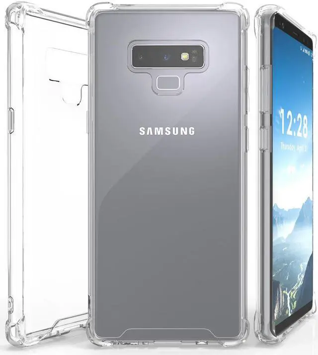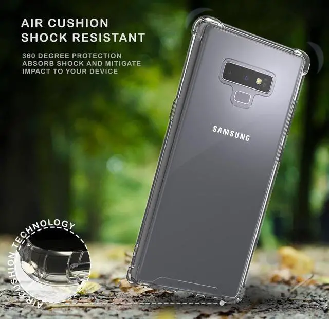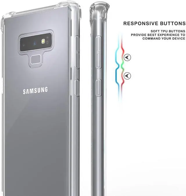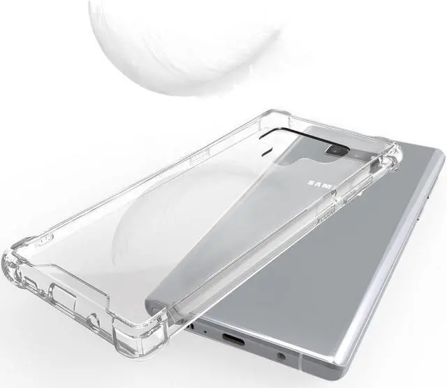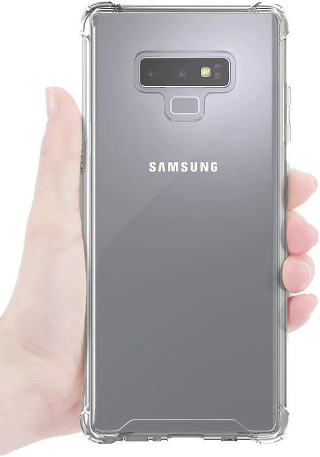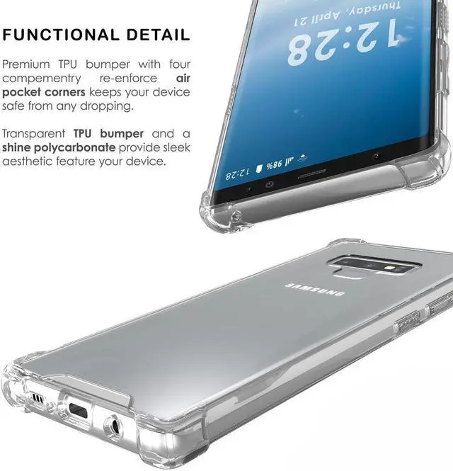 MATERIAL: This is a one-piece case that combines hard plastic with flexible shock-absorbing TPU bumper. The clear hard backside will showcase the original design and beauty of your Samsung Galaxy Note 9 phone. The flexible sides are made of TPU material. All 4 corners feature elevated bumpers for shock absorption.