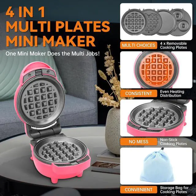 BEYOND WAFFLES: Create mini waffles in rounded or heart shapes, as well as paninis, hash browns, and even biscuit pizzas! When you use a wet batter, it will create single serving portions of your treats and snacks in a waffle shape. Perfect for children or for when you're in a hurry! BEYOND PANCAKES AND DONUTS: You can create single portions of eggs, cookies, pancakes, grilled cheese, arepas, and mini doughnuts without requiring multiple cooking utensils! COMPACT & LIGHTWEIGHT: weighing over 1lb, this product is an essential item for a first apartment, a smaller kitchen, college dormitories, or when traveling in a camper/RV. FAST & CONVENIENT: Just connect it to a power source and start using it; it reaches the desired temperature within just a few minutes. Every time, the consistent results are achieved because of the two non-stick surfaces that evenly cook the food. The cooking plates can be easily removed and are suitable for cleaning in a dishwasher. IDEAL PRESENT: An excellent choice for weddings or housewarmings, this compact item occupies minimal countertop area. Its sleek and fashionable design, along with a variety of trendy hues, effortlessly complements any kitchen style.