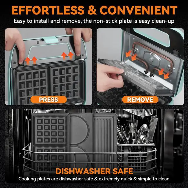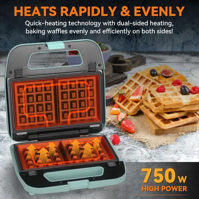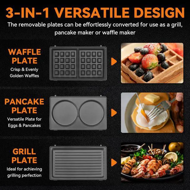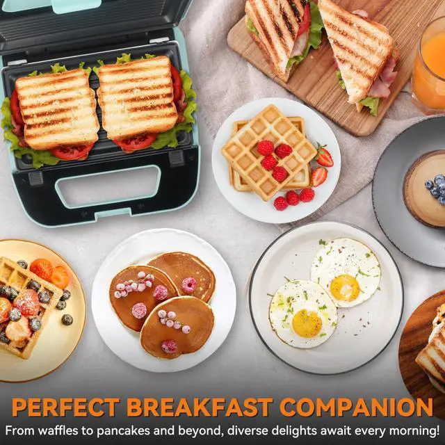 [3-IN-1 MULTI-FUNCTION BAKING PLATE]: There are three sets of plates that can be switched at will. The pancake plate can be used to make Pancake and fried eggs; the waffle plate can be used to make waffle desserts, and the grill plate can grill steak, pork chops and corn, Potatoes, tomatoes, vegetables, etc, can also be used to press panini. [EFFORTLESSLY ENJOY DELICIOUS MEALS]: With its double-sided heating function, it can cook two slices simultaneously in just a few minutes, making it perfect for busy office workers who want to enjoy homemade meals quickly. [COMPACT & USER-FRIENDLY]: Designed for small kitchens, dorm rooms, offices, this electric waffle maker boasts a cool-touch handle for safe and convenient use. Simply follow the indicator lights for easy operation and delicious results in no time. [EFFORTLESS CLEANUP]: The non-stick surface eliminates the need for oil or butter, promoting healthier eating and simplifying cleanup. Simply wipe the surface with a soft towel and rinse, or disassemble the plates for dishwasher cleaning. [IDEAL KITCHEN GADGET FOR ANY OCCASION]: The 3-in-1 waffle maker is an excellent choice for housewarming parties, Thanksgiving, birthdays, Christmas, weddings, and more. It's a fantastic gift for your wife, mom, friends, college students, and anyone who loves to cook and eat.