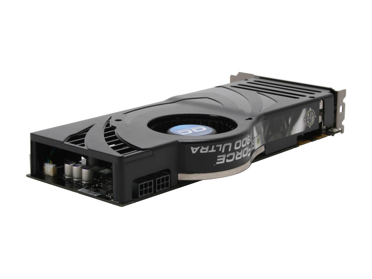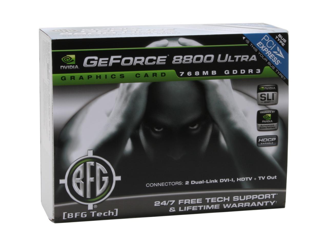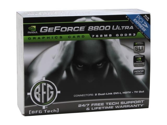 | System Requirements | 1GB of system memory CD-ROM drive 50MB of available hard disk drive space for basic driver installation PCI Express-compliant motherboard with one vacant PCI Express x16 slot One vacant slot below the PCI Express x16 slot. This graphics card physically occupies two slots 525W PCI Express-compliant system power supply with a combined 12V current rating of 37A or more* Two 6-pin PCI Express supplementary power connectors -or- Four 4-pin Molex supplementary power connectors Note: For the power requirements of two BFG NVIDIA GeForce 8800 Ultra-based graphics cards running in an NVIDIA SLI configuration *Minimum system power requirement based on a PC configured with an Intel Core 2 Extreme QX6700 processor. |