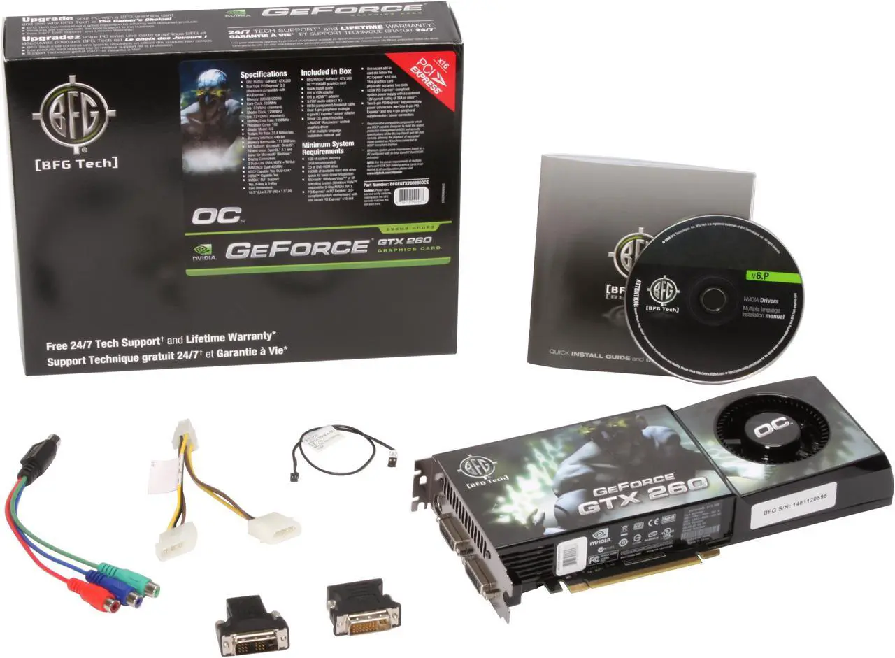 | Package Contents | BFGEGTX260896OC Driver Disk User's Manual HDTV Cable Power Cable DVI to VGA/D-sub Adapter DVI to HDMI Adapter S/PDIF Cable |
