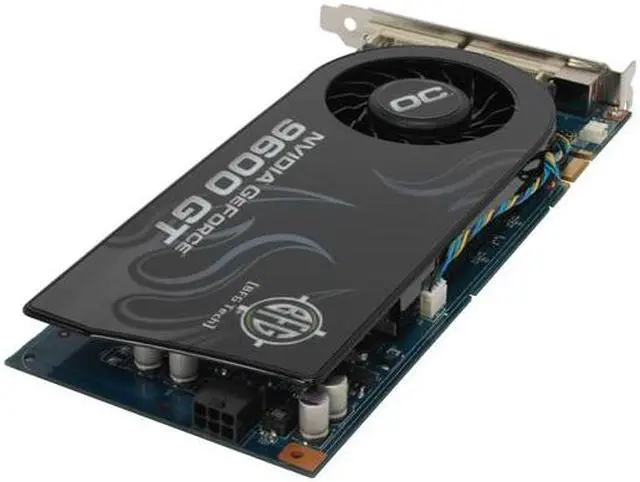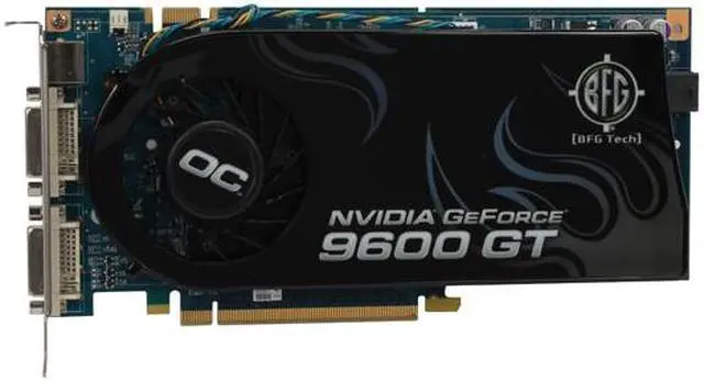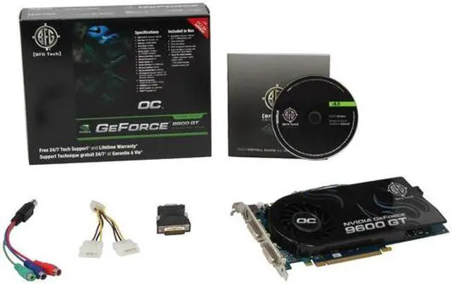 | System Requirements | 512MB of system memory CD or DVD-ROM driver 100MB of available hard disk drive space for basic driver installation PCI Express-compliant motherboard with one vacant PCI Express x16 slot 425W PCI Express-compliant system power supply with a combined 12V current rating of 28A or more* One 6-pin PCI Express supplementary power connector -or- Two 4-pin Molex supplementary power connectors NOTE: For the power requirements of two GeForce® 9600 GT-based graphics cards in an NVIDIA SLI configuration, please visit www.bfgtech.com/slipower *Minimum system power requirement based on a PC configured with an Intel Core 2 Extreme X6800 processor |
