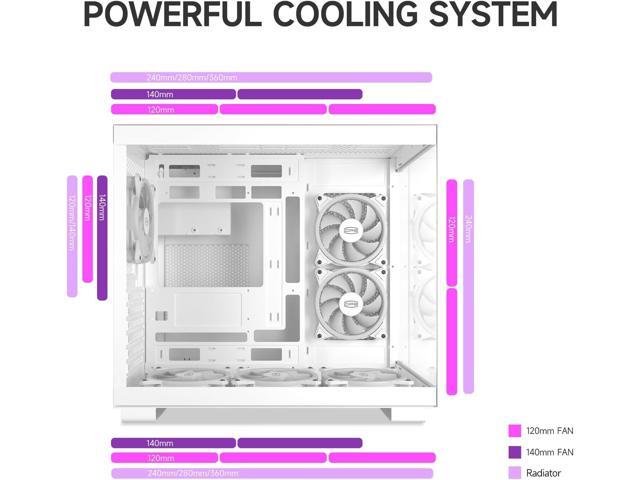 6 argb case fans(120mm×120mm) are included in the package of C3T500 PC case,PCCOOLER Considering that computer game players need a more powerful cooling systems,so we have reserved the installation position of the top and bottom CPU water cooling system in the computer case,supporting 280mm&360mm water cooling system,you can also choose height limit 175mm air cooling system.