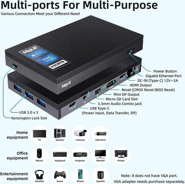 Windows 11 Pro & Multi-PortsThe Micro PC preinstalled with Windows 11 pro, Support Windows 10, Also support Linux and other systems as you like. Micro PC has many convenient daily interfaces: 1x Gigabit LAN (RJ45 port), 3x USB 3.0, 1x HDMI 2.0, 1x Type-C(Power input, data transfer,... ), 1x MINI DP, 1x 3.5 mm Audio combo jack, 1x Micro-SD Card Slot, Just add a keyboard, mouse, and up to two displays, you can turn your desk into a workstation, and you can use VESA to mount the small pc on your monitor.