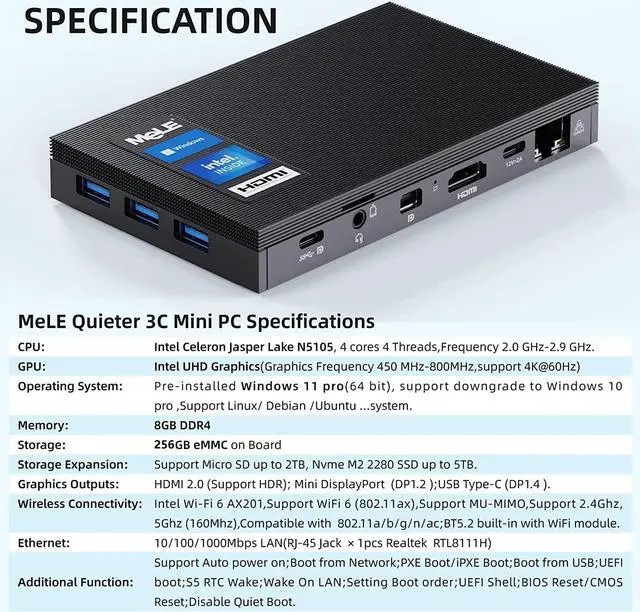 Powerful Capacity & Flexible Storage ExpansionMeLE Quieter 3C come with 8GB LPDDR4 and 256GB eMMC, it supports expansion support Mirco SD card up to 2TB, support M. 2 SSD (2280) up to 5TB, 2.5 '' HDD up to 5TB. (not included)
