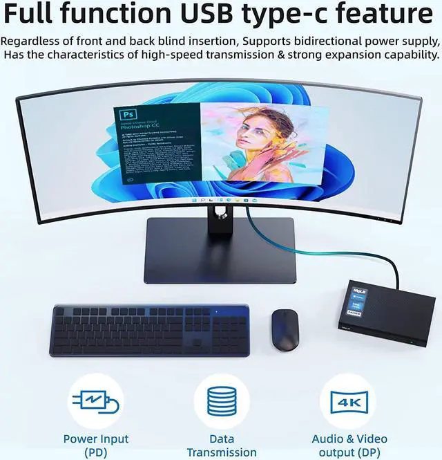 Resolution: 4096x2160@60Hz, Combines DisplayPort (DP 1.4 ), USB 3.1 Gen1( Theoretical data speed USB 3.1 Gen 1=5Gbps) and Power input(With PD 3.0 protocol, 12-18V), all in one cable. Supports bidirectional power supply, Has the characteristics of high-speed transmission & strong expansion capability.