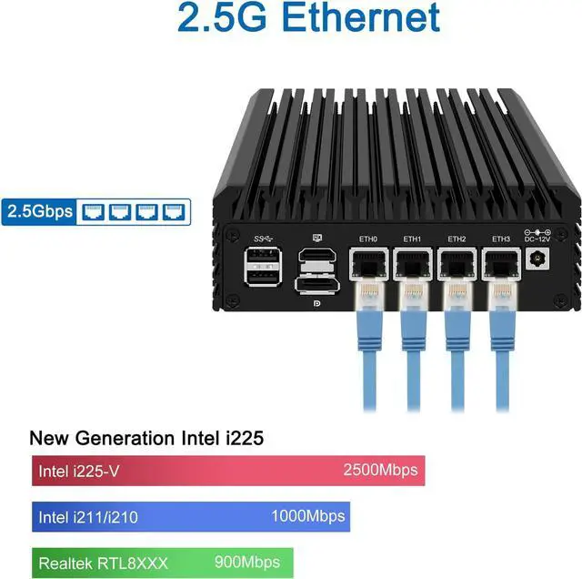 Intel I226 2.5G bE Network CardThis Firewall Router equipped with 4*Intel I226 Network card maximum up to 2.5G bE, bring you more faster and professional network usage(some system suppliers maybe have not released compatible driver to match yet, suggest to install newest version of following systems: pfSense 23.01 (or 2.7. 0), Untangle ( via virtual machine) OPNsense 22.1, OpenWrt, ROS7, ESXI, Proxmox, CentOS etc).