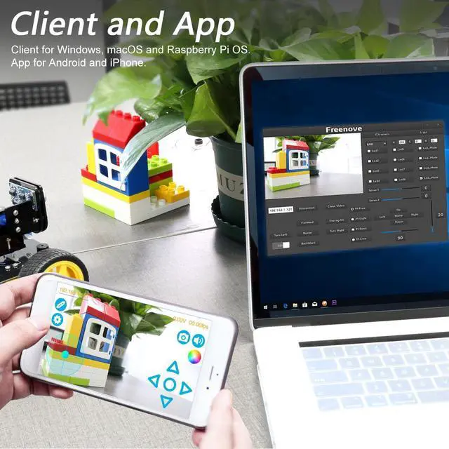 Control methods -> Controlled wirelessly by your Android phone or tablet, iPhone and computer (run Windows, macOS or Raspberry Pi OS).
