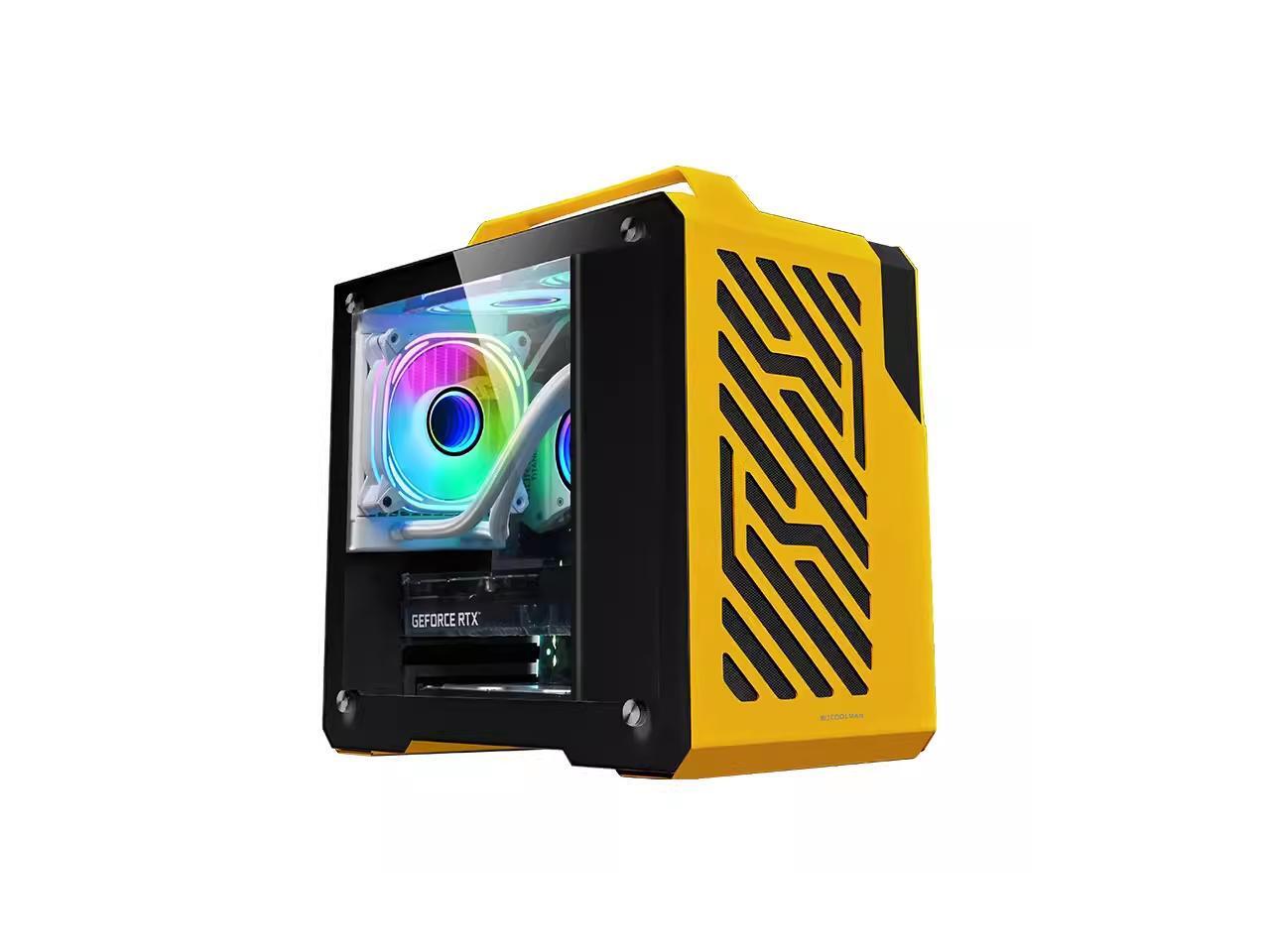 Small Computer Case, Lightweight and Portable Aluminum ITX/MATX Personal Computer Case with Tempered Glass - Yellow