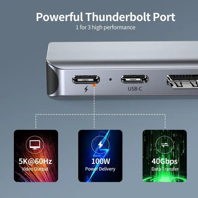100W Power DeliveryThis MacBook Docking Station provides 85W of charging power for your laptop, with 15W reserved for connected peripherals. When using an external hard drive for data transfer, ensure that the laptop is in a charging state. Note: For stable connection, please do not use this Macbook adapter for high-power devices. It supports up to one hard drive and does not support Apple USB Super Drive.