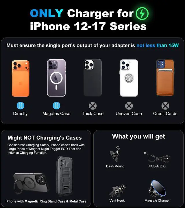 ![Alt view image 4 of 7 - for iPhone 17 Magsafe Car Mount Charger, [2026 New] 15W 2in1 Magnetic Wireless Car Charger, fits for Magsafe Car Charger, Vent/Dashboard Phone Holder Mount for iPhone 17 16 15 14 13 12 Series](https://c1.neweggimages.com/productimage/nb640/C691D2604220I8X8GAA.jpg)