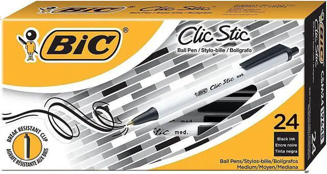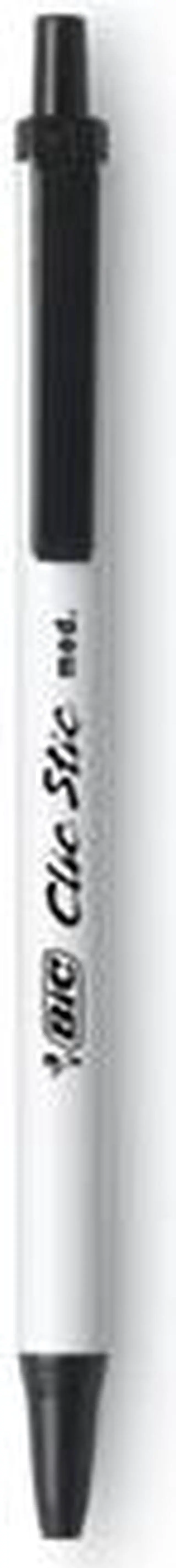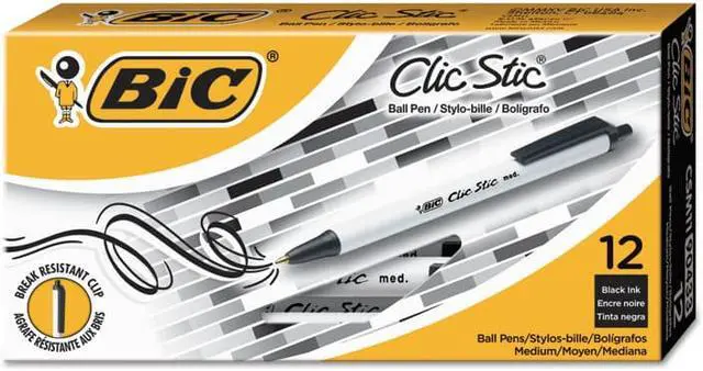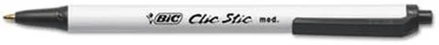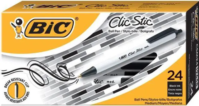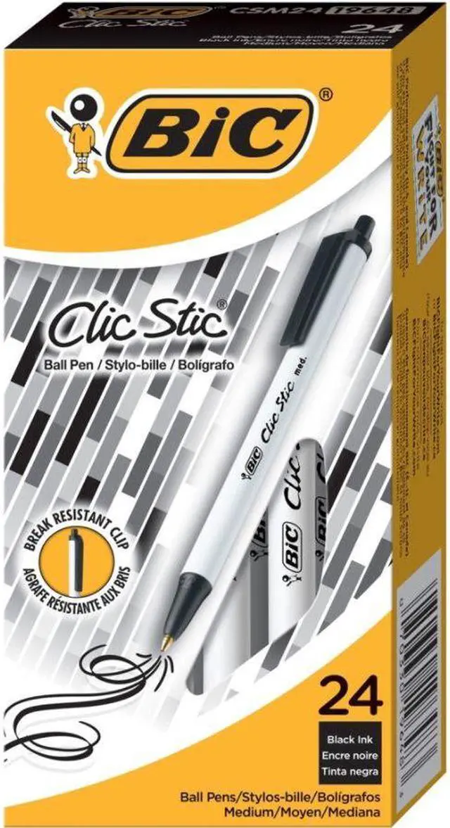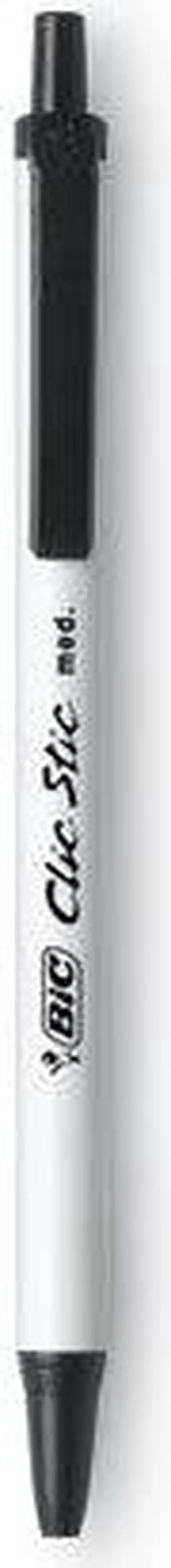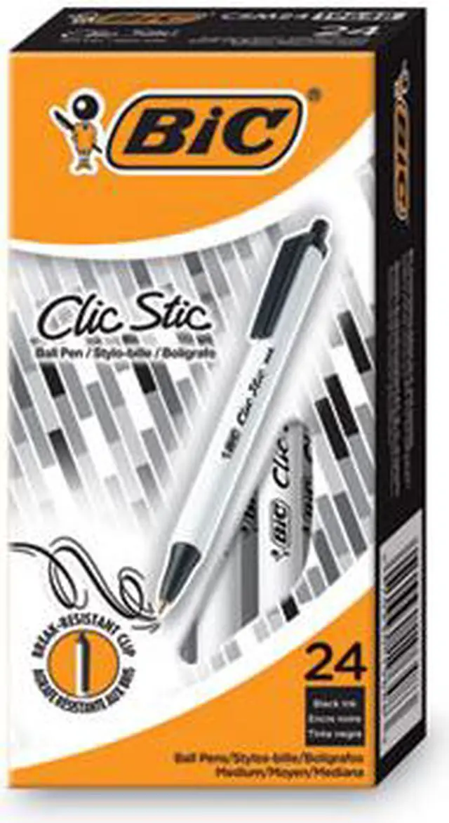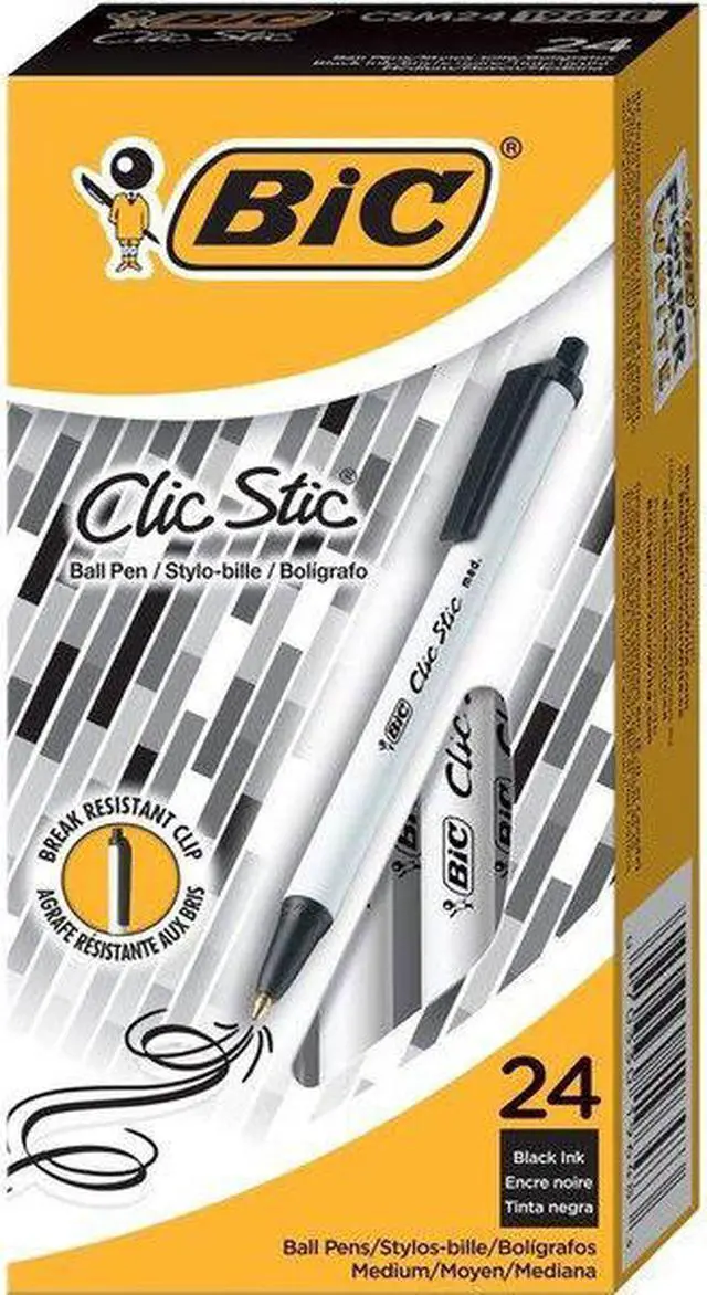 Vivid, Black InkMake an impression when you write with these BIC clic stic retractable ballpoint pens. Vivid, black ink flows out through the 1.0 millimeter medium tips to create bold lines with each stroke. Smudged or smeared documents are a thing of the past thanks to these pens' quick-drying ink formula.Retractable BallpointProtect your pen from dust and grime without having to cap or uncap it each time you use it. BIC clic stic retractable ballpoint pens come with retractable tips that click conveniently within when not used. This eliminates the hunt for lost pen covers while helping to keep dirt away.Convenience and PortabilityEasily carry these BIC clic stic retractable ballpoint pens wherever you go thanks to their convenient pocket clips. These break-resistant clips hold your pen securely in your bag or binder, letting you access it quickly when needed without hunting for it.
