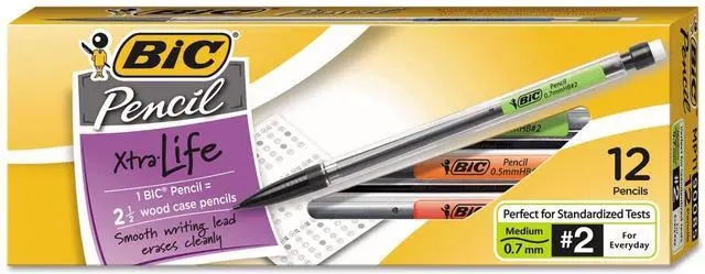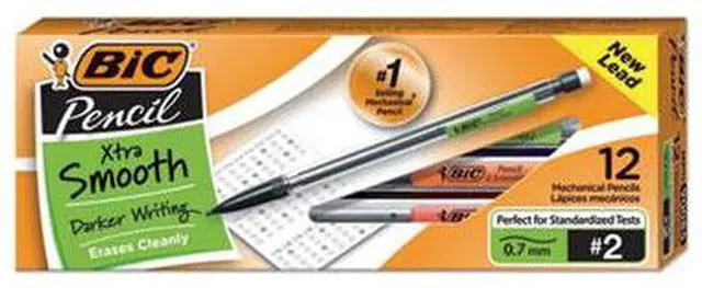 These 0.7mm mechanical pencils have a medium point thats ideal for a variety of everyday writing activities. Theyre excellent mechanical pencils for school and come equipped with three pieces of No. 2 lead thats compatible with most standardized tests. The high-quality lead in these Bic mechanical pencils doesnt smudge and erases cleanly, so your work looks neat and professional. Convenient and reliable, BIC Xtra-Smooth Number 2 Mechanical Pencils are always ready and never need sharpening; to advance the mechanical pencil lead, simply click the built-in eraser. These BIC mechanical pencils have a sophisticated, modern look, and their colorful clips easily attach to pockets, notebooks and more. The No. 1 selling mechanical pencil brand in the United States*, BIC offers dependable performance and value that you can trust. Looking for larger quantities of school or office supplies? This 12-count mechanical pencils bulk pack will keep your desk stocked all year. Choose BIC Xtra-Smooth No. 2 Mechanical Pencils With Erasers for a high-quality, safe and affordable product you can trust. *Source: The NPD Group/Retail Tracking Service and Commercial Tracking Service, U.S., based on actual unit sales, 12ME June 2022 combined.