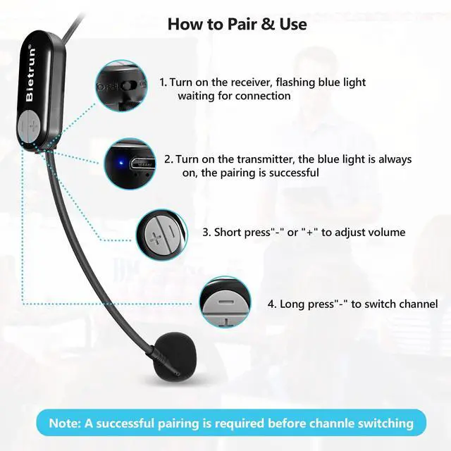 When multiple sets of WXM05 are used in the same place at the same time, the frequency point needs to be cut: Press and hold volume "-" button for 5 seconds to switch the frequency randomly. It supports up to 15 sets of WXM05.