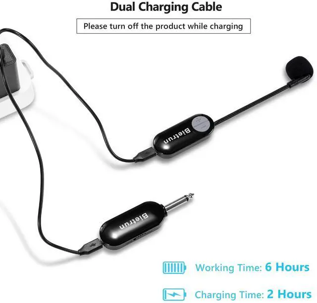6 hours working time. Fully charging time only takes 2.5 hours, USB cord has two charge port which can be used for charging the transmitter and receiver at the same time
