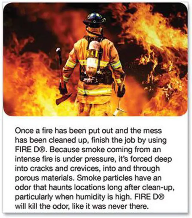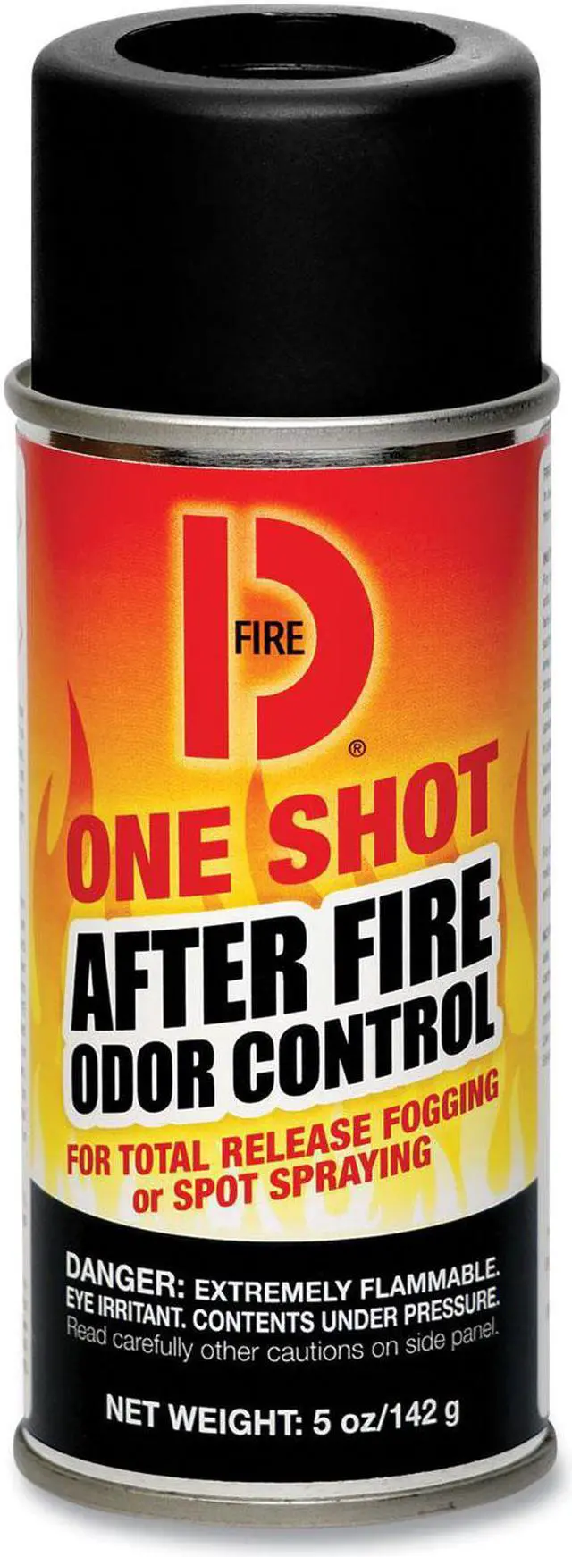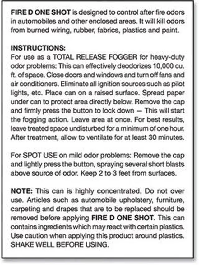 Because smoke coming from an intense fire is under pressure, it is forced deep into cracks and crevices, into and through porous materials. Smoke particles have an odor that haunts building owners long after clean-up, particularly when humidity is high. FIRE D will finish the job by removing the odor. Use FIRE D ONE SHOT AEROSOL FOGGER to kill after-fire odors in automobiles and other small enclosed areas where a fogging machine would be awkward or electrical power is not available. Use one can for every 10,000 cubic feet of space. Scent: Original; Physical Form: Liquid; Application: Fire Odor Control; Capacity (Volume): 5 oz.