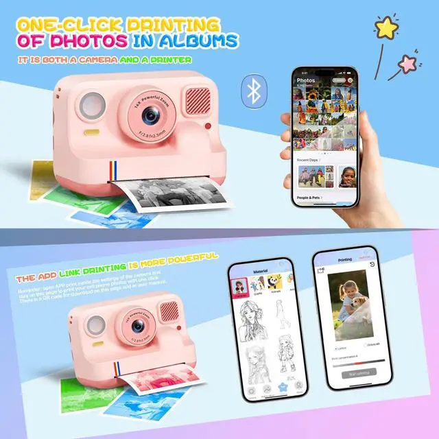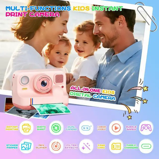 It features a variety of fun filters and creative stickers to capture precious moments. Instant printing lets children print and cherish every precious moment – a creative companion that grows with them.
