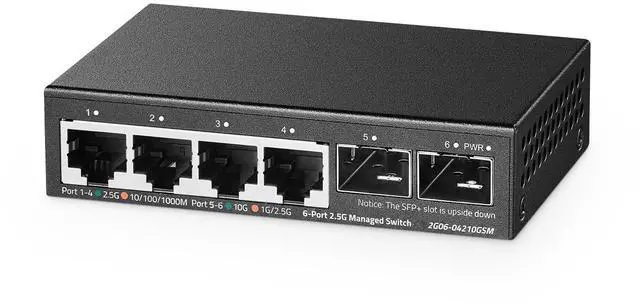 The 2G06-04210GSM is a desktop web managed switch with 4x 2.5GbE RJ45 ports and 2x 10GbE SFP+ uplink ports, It can connecting 1G/2.5GE/10G devices with different interfaces at an affordable price. Suitable for SMB and SOHO users.