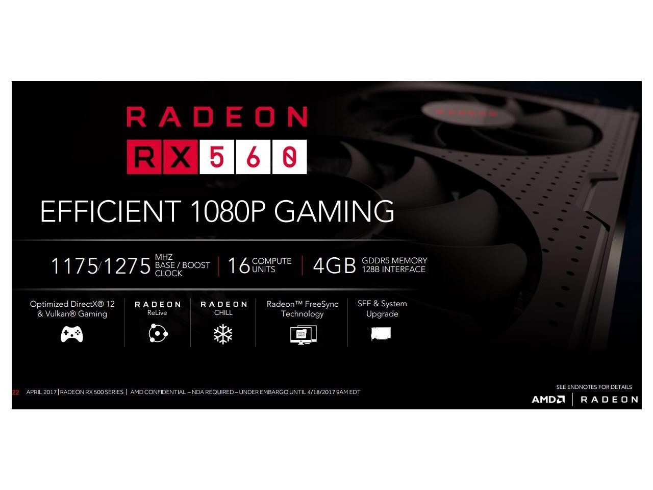 - Radeon RX 560 Gaming GPU 14 CU, Base Frequency Up to 1176 MHz, Boost Frequency Up to 1275 MHz, Peak Pixel Fill-Rate Up to 20.4 GP/s, Peak Texture Fill-Rate Up to 81.6 GT/s, Max Performance Up to 2.6 TFLOPs, ROPs 16, Stream Processors 896, Texture Units 64, Transistor Count 3 Billion