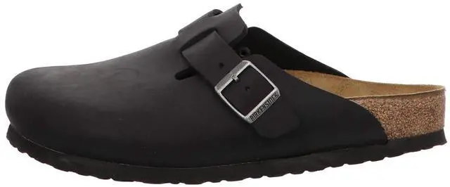 The Boston, our most popular clog, adds a stylish touch to any ensemble. Crafted with care, oiled nubuck leather boasts a heritage look that develops a unique patina over time. It features iconic BIRKENSTOCK elements like a contoured cork-latex footbed for superior support. Key features include a custom-supporting footbed, color-varying oiled leather upper, comfortable suede lining, flexible EVA sole, adjustable buckle strap, and a 'Made in Germany' stamp. The upper is made from sturdy, 2.8 - 3.2 mm thick oiled leather, while the footbed is sustainable cork, and the outsole is lightweight EVA.