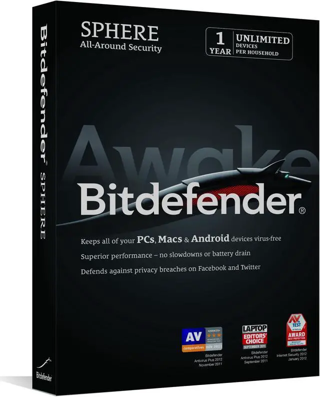 | Feature | Bitdefender Sphere provides all-around security for an unlimited number of desktops, laptops and mobile devices in your home. This unified security solution enables households running any combination of PCs, Macs and Android-based Smartphones or Tablets to protect all their devices from an array of e-threats, such as viruses, spyware, spam and phishing attacks. Key Features: - Protects all your PCs, Macs and Android devices (Smartphones or Tablets) for 1 year - Safeguards privacy, counters e-threats on an unlimited number of devices - No slowdown - superior performance - Blocks e-threats on social networks - Shop, bank, play and work securely wherever you are - Parental Control, Online Backup & Tune-Up included (PC only) For PCs: - Blocks viruses, spyware & spam - Halts ID theft attempts - Blocks social-networking specific e-threats - Keeps kids safe with cutting-edge parental controls - Protects your data with Online Backup - Tunes up your PC for optimal speed & performance For Smartphones & Tablets: - Uses in-the-cloud services to defend your Android device against viruses and spyware - Helps users remotely find their mobile device - Remotely lock, send message to, or wipe device, in case of loss or theft of the smartphone or tablet - Gives advance warning of risky websites when browsing on your mobile device For Macs - Protects your valuable files and documents from all Mac viruses - Blocks webpages that attempt to steal your credit card data - Prevents you from passing viruses along to your friends working on Windows machines - Uses minimal system resources - won't slow you down |