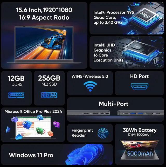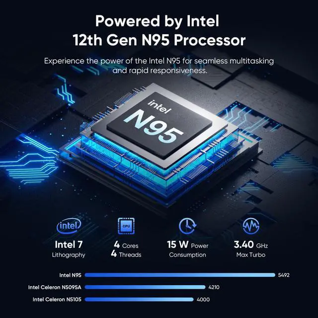 Processor: Intel Quad Core N95 (4 cores, 4 threads, up to 3.4GHz)