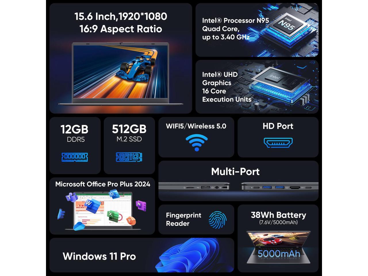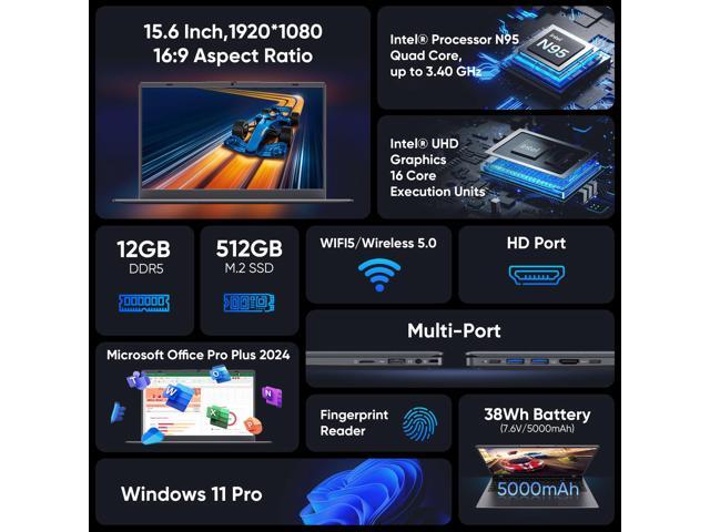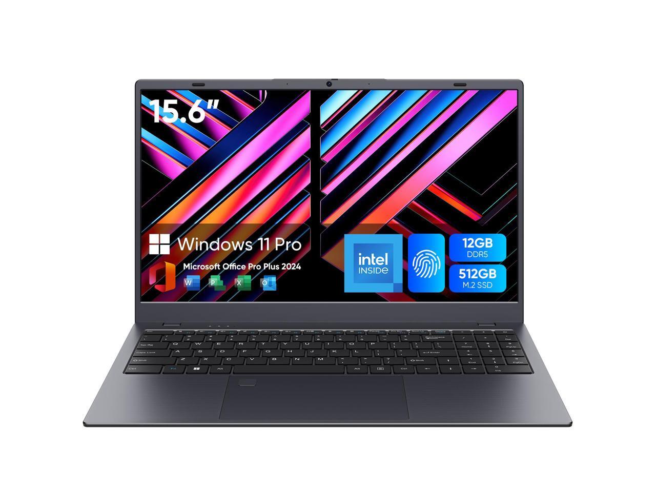 BiTECOOL Laptop Computer 15.6 inch, Intel Quad Core N95, 12GB LPDDR5 RAM 512GB NVMe SSD Laptop with FHD IPS Display, WiFi 5, BT5.0, USB Type C and Fingerprint, 2 Years Warranty, Windows 11 Pro