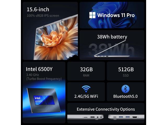 BiTECOOL 15.6-inch FHD IPS Laptop, 32GB RAM 512GB SSD, Intel Pentium Gold 6500Y (up to 3.4GHz), 4 Speakers, 2.4/5G WiFi Bluetooth 5.0, Windows 11 Pro Lightweight Portable Notebook
