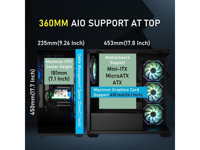 360mm AIO/Watercooling Support, GPU Support 410mm, Air Cooler Support 181mm, PSU Support 200mm